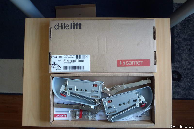Für die Befestigung der Truhendeckel habe ich mir lange Gedanken gemacht. Es braucht ein Scharnier, einen Schutz gegen herunterfallen und als Schmankerl ein Softclose. Ich könnte Klappenstützen verwenden, bräuchte dann aber immer noch ein Scharnier z.B. Topfbänder. Nun habe ich mich für Samet Klappenbeschlag D-Lite lift entschieden. Damit habe ich alles in einem und es ist dazu noch justierbar. Eigentlich sind diese für Küchenschränke, die nach oben klappen, gedacht.