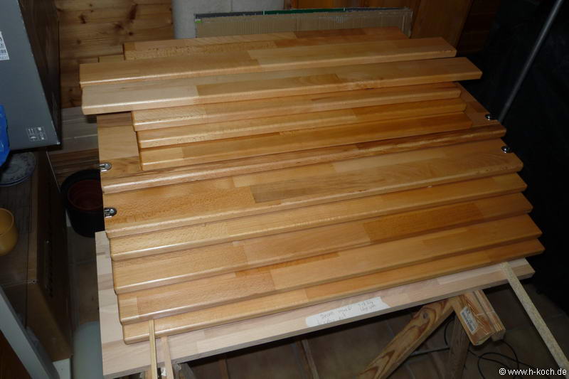Anschließend ging es ans Ölen. Ich habe jedes Brett 3 mal geölt. Nach dem zweiten Ölen habe ich nochmal mit 320er Körnung geschliffen.