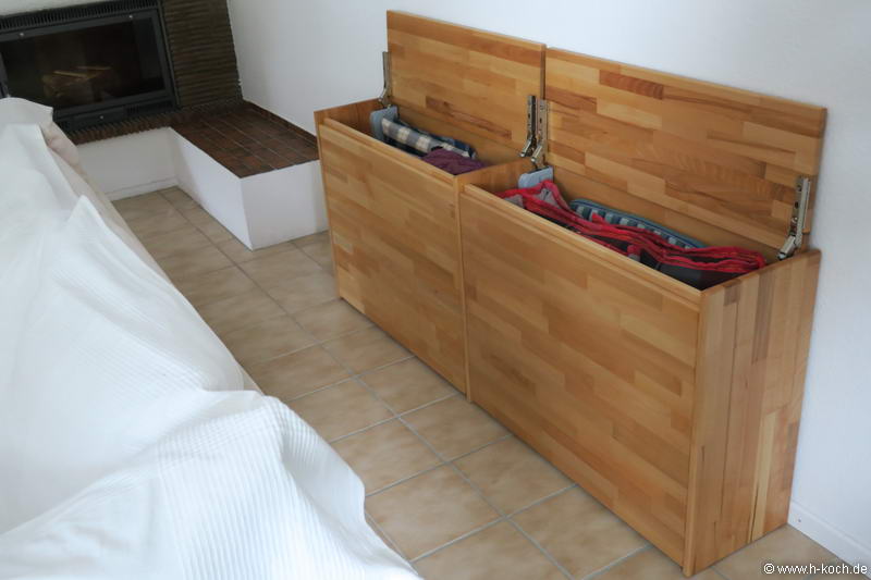 ... eine Truhe fürs Wohnzimmer. In ihr sollen die Sitzauflagen der Terrassenmöbel und Decken aufbewahrt werden.